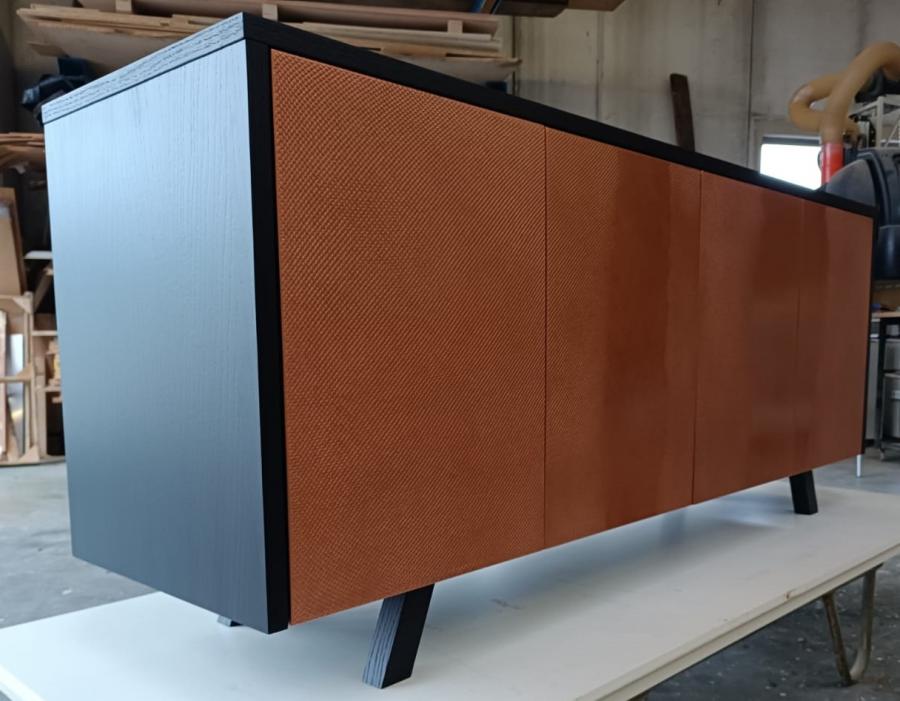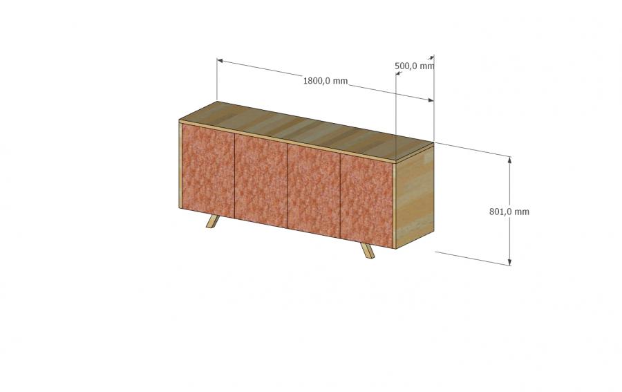 Madia a 4 ante cm 180x80x50p, realizzata in listellare impiallacciato rovere spazzolato, completa di ripiani interni.